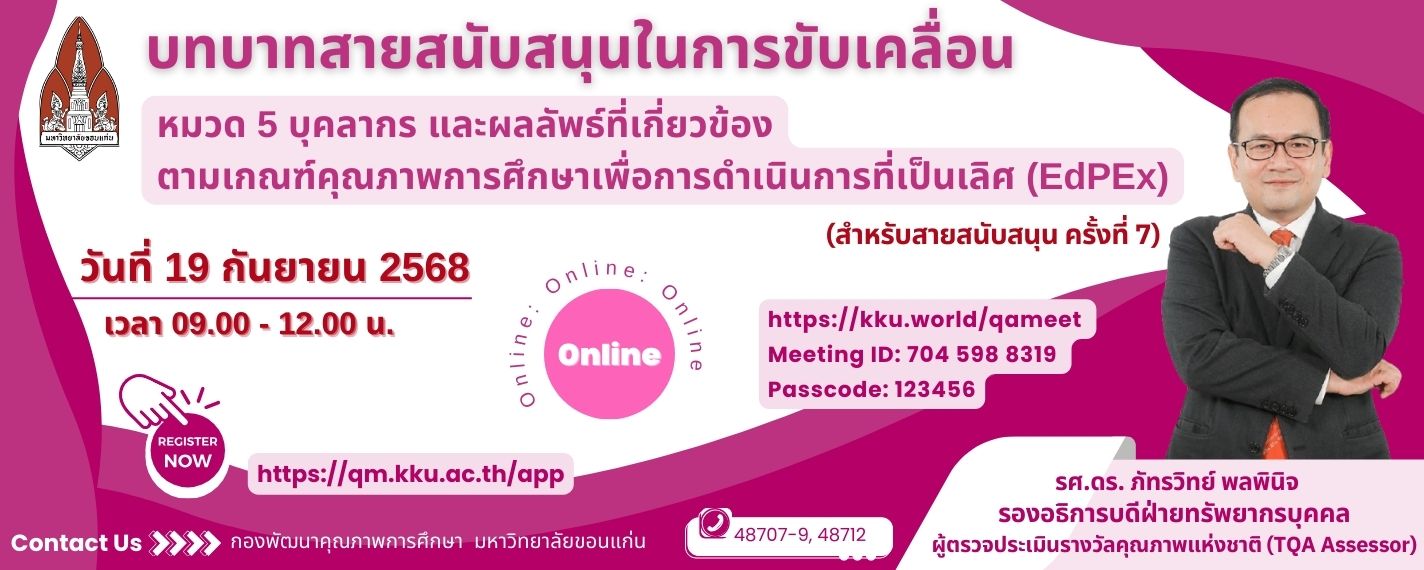 เมื่อวันที่ 19 กันยายน 2568 เวลา 09.00-12.00 น. กองพัฒนาคุณภาพการศึกษา ได้จัดโครงการพัฒนาสมรรถนะเครือข่ายการพัฒนาคุณภาพการศึกษา สายสนับสนุน (QA อาสา) ครั้งที่ 7 ขึ้น ภายใต้หัวข้อ "บทบาทสายสนับสนุนในการขับเคลื่อน หมวด 5: บุคคล และผลลัพธ์ที่เกี่ยวข้อง ตามเกณฑ์คุณภาพการศึกษาเพื่อการดำเนินการที่เป็นเลิศ (EdPEx)" ซึ่งจัดขึ้นในรูปแบบออนไลน์ โดยมีวัตถุประสงค์เพื่อให้ผู้ปฏิบัติงานสายสนับสนุนทั้งในระดับส่วนงาน ระดับหน่วยงาน ตลอดจนผู้ที่สนใจทั่วไป มีความรู้ความเข้าใจเกี่ยวกับหมวด 5 บุคลากร (People) หมวด 7 ผลลัพธ์ (Result) ที่เกี่ยวข้อง อันจะนำไปสู่การยกระดับขีดความสามารถของส่วนงานและหน่วยงานสู่องค์กรแห่งความเป็นเลิศตามที่มหาวิทยาลัยกำหนดได้